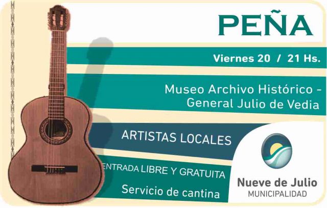 Con la organización de la Dirección de Museos y Archivo Histórico y la Dirección de Cultura de la Municipalidad de 9 de Julio, el próximo viernes 20 de del corriente, desde las 21 hs., se desarrollará en la sede del Museo, de Cardenal Pironio y Edison, una gran peña con artistas locales.