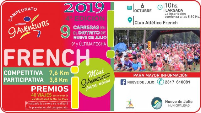 A través de la Dirección de Deportes de la Municipalidad de Nueve de Julio el Campeonato “9 Aventuras”, que abarca 9 competencias atléticas en el partido llevará a cabo su novena y última jornada del calendario 2019, el 6 de octubre próximo en la localidad de French, con largada a las 10 hs., desde la sede del Club Atlético de esta localidad.