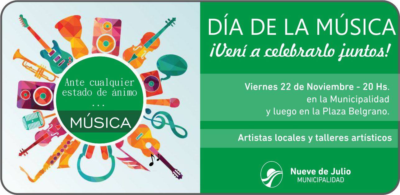La Dirección de Cultura de la Municipalidad de Nueve de Julio llevará adelante, el próximo viernes 22, a las 20 hs., en el Palacio Municipal y posteriormente en Plaza Belgrano, un gran festival celebrando el Día de la Música, instancia en la que se presentarán artistas locales y talleres artísticos.