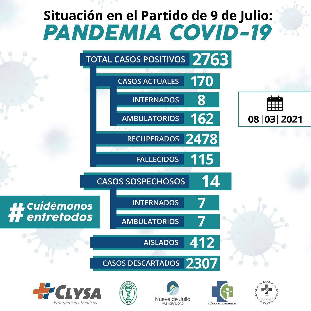 El Comité de Crisis en Salud del Partido de 9 de Julio informó este lunes 8 de marzo que se confirmaron 9 casos nuevos de Coronavirus en una jornada en la que no se recibieron altas ni se dieron a conocer fallecidos (el último fue ayer, la víctima 115). De esta manera, los casos activos de pacientes con Covid-19 ascienden a 170.
