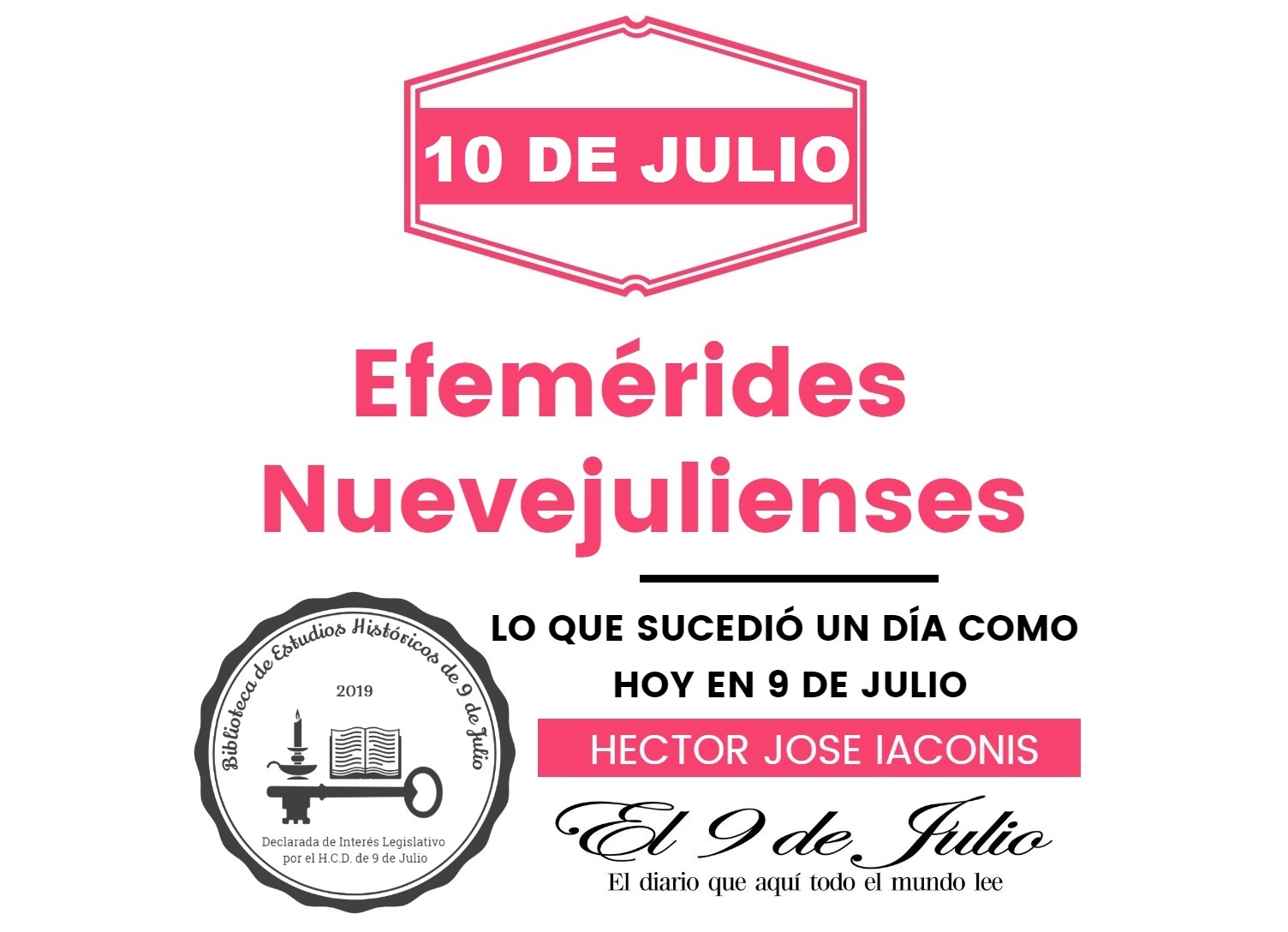 - 10 de julio de 1905: Falleció en Buenos Aires el mayor Guerrino Greni. En 1868 había pasado a revistar en la Frontera Oeste, con asiento en 9 de Julio. Enseguida se vinculó a la pequeña sociedad nuevejuliense del naciente pueblo. En febrero de 1876 fue elegido consejero municipal titular para la Corporación Municipal de 9 de Julio. En 1877 fue consejero escolar de 9 de Julio y, ese mismo año, fue nombrado para integrar el Juris sobre clasificaciones de patentes en 9 de Julio.