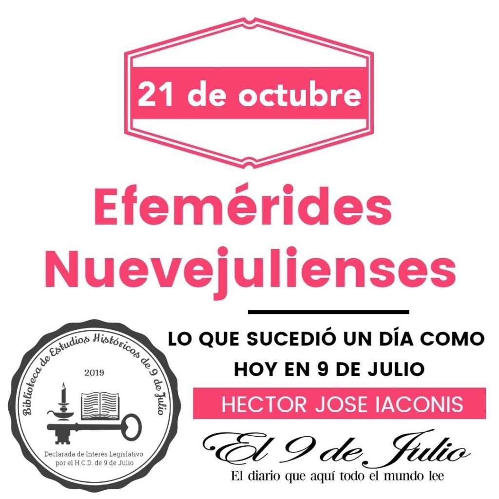 • 21 de octubre de 1889: Fue sancionada la nueva Constitución de la Provincia de Buenos Aires, la cual reformaba la de 1873. La misma fue jurada por el pueblo de 9 de Julio, pocos días más tarde, desarrollándose un programa de festejos organizado por una Comisión Oficial, presidida por el vecino Angel Molinero.