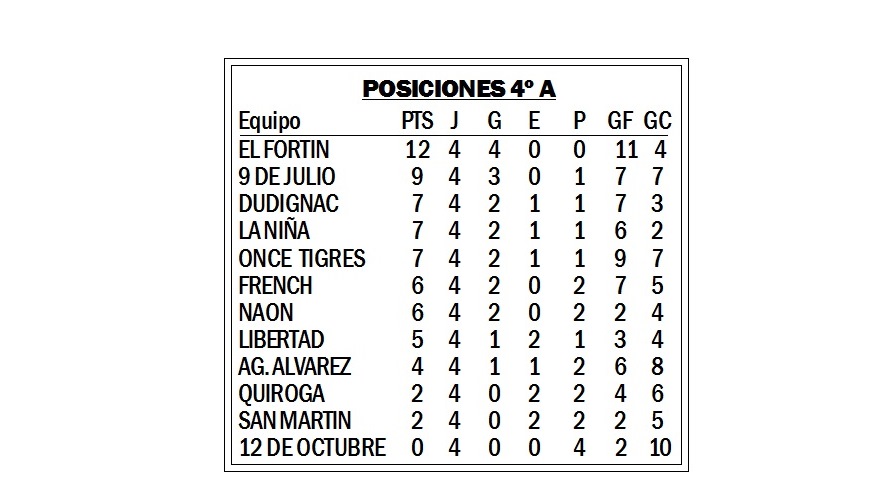 El fin de semana se jugó la cuarta fecha del Campeonato de Cuarta División de la Liga Nuevejuliense de Fútbol. Sigue como único líder El Fortín luego ganar 3 a 1 a Once Tigres. Atlético 9 de Julio venció 2 a 1 a 12 de Octubre. Empataron 0 a 0 San Martín y Dudignac.
