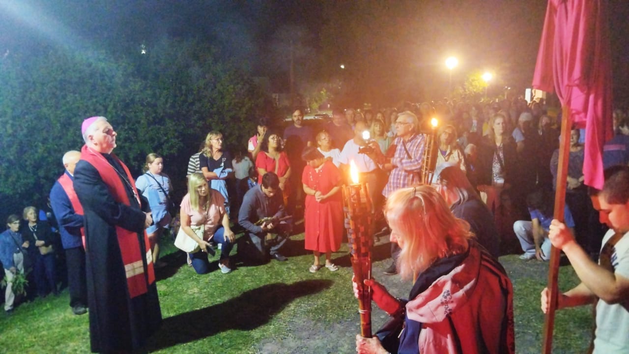 Siguiendo el programa previsto para la celebración de la Semana Santa, en la noche de ayer, tuvo lugar la realización del Via Crucis, en el paseo de la ciudad homónimo, donde se encuentran ubicadas las estaciones. El mismo fue presidido por el Obispo de la Diócesis de 9 de Julio, monseñor Ariel Torrado Mosconi y contó con la participación de un buen número de fieles.