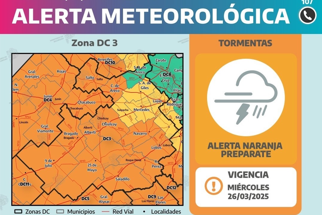 El Servicio Meteorológico Nacional (SMN) emitió alertas de nivel amarillo por lluvias y tormentas sobre el área del distrito de 9 de Julio y una amplia región.