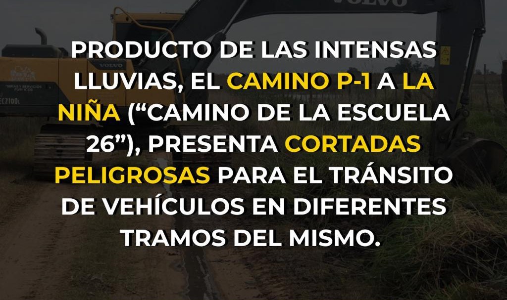 La Municipalidad de 9 de Julio informó que, como consecuencia de las intensas lluvias registradas en los últimos días, el camino a la localidad de La Niña (P 1), a unos 4 km. de su inicio desde Ruta Provincial Nro. 65, presenta cortadas peligrosas para el tránsito de vehículos.