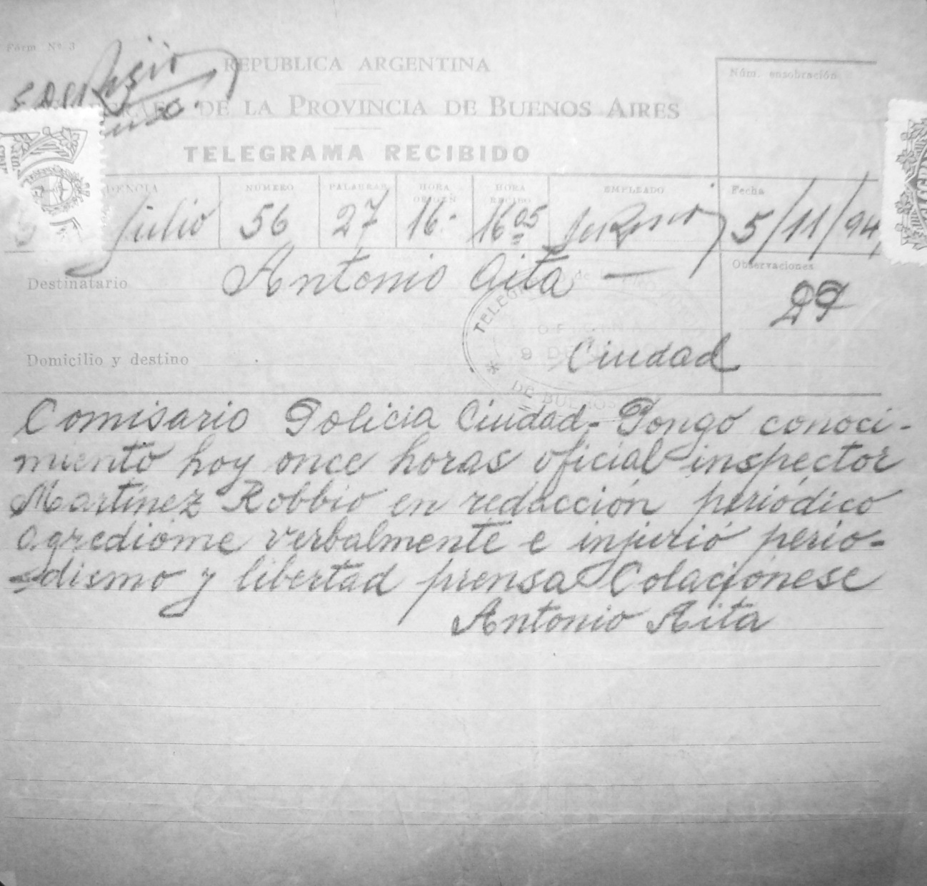 Comisario Policia Ciudad Pongo conocimiento hoy once horas oficial inspector Martinez Robbio en redaccion periodico agredionme verbalmente e injurio periodismo y libertad prensa Colacionese