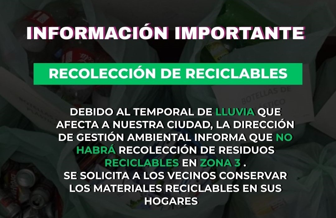 comunidad que debido al temporal de lluvias que afecta a nuestra ciudad, no se realizará la recolección de residuos reciclables en la Zona 3.