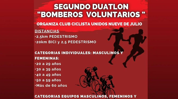 El próximo domingo 14 de septiembre, en el Club Ciclista Unidos de 9 de Julio se llevará a cabo la segunda edición del Duatlón “Bomberos Voluntarios”.