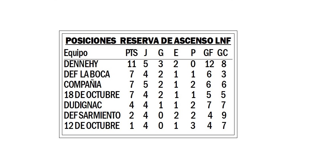 El domingo 14 de septiembre se jugó la quinta fecha del Torneo de Reserva de Ascenso organizado por la Liga Nuevejuliense de Fútbol. El equipo de Dennehy empató 2 a 2 con Defensores de Sarmiento, manteniendo su invicto y con una diferencia de cinco puntos en la punta, aunque en la próxima quedará libre.