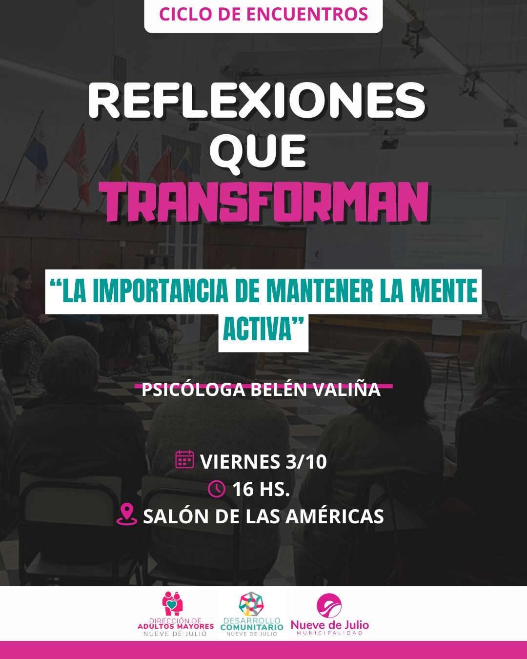 La Municipalidad de 9 de Julio, a través de la dirección de Adultos Mayores, dependiente de la secretaría de Desarrollo Comunitario, invita a la comunidad a participar de un nuevo encuentro del ciclo “Reflexiones que transforman”.