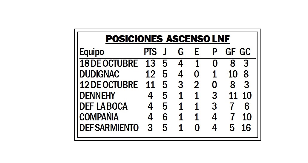 El sábado 4 de octubre se reanudó el Campeonato de Ascenso de la Liga Nuevejuliense de Fútbol, después de dos suspensiones por lluvia. El líder 18 de Octubre rescató un empate en 12 de Octubre ante el escolta y eso le permite mantenerse en lo más alto.