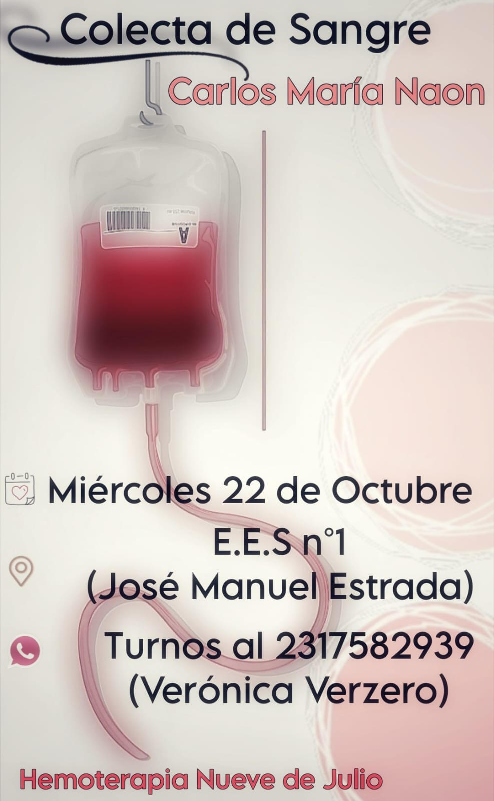El miércoles 22 de octubre a partir la hora 8 se llevará a cabo la próxima colecta de sangre en Carlos María Naón, convocada por el servicio de Hemoterapia y la Escuela Secundaria Nro 1 «José Manuel Estrada» de la localidad. Los donantes pueden confirmar su turno, para concurrir en forma organizada, al 2317 582939, Verónica Verzero.