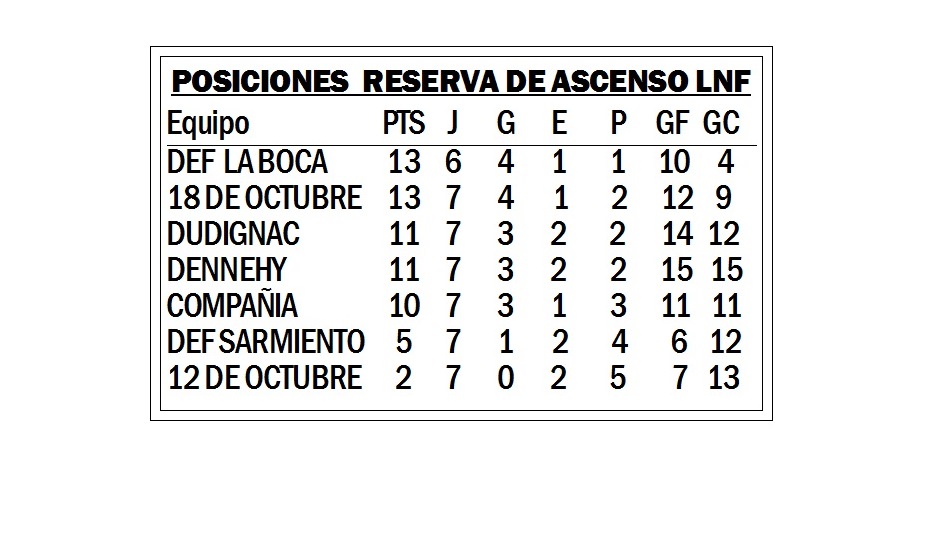 Se jugó la octava fecha del Torneo de Reserva de Ascenso organizado por la Liga Nuevejuliense de Fútbol. El equipo de 18 de Octubre venció a Dennehy y de ese modo alcanzó en la punta a Defensores de la Boca (quedó libre).