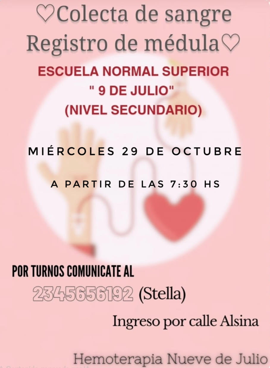 El próximo miércoles 29 de octubre tendrá lugar una nueva colecta de sangre convocada por el Servicio de Hemoterapia del Hospital Julio de Vedia en el SUM la Escuela Normal Superior – a partir de las 7.30 horas. Reservar turnos al 2345 656192.