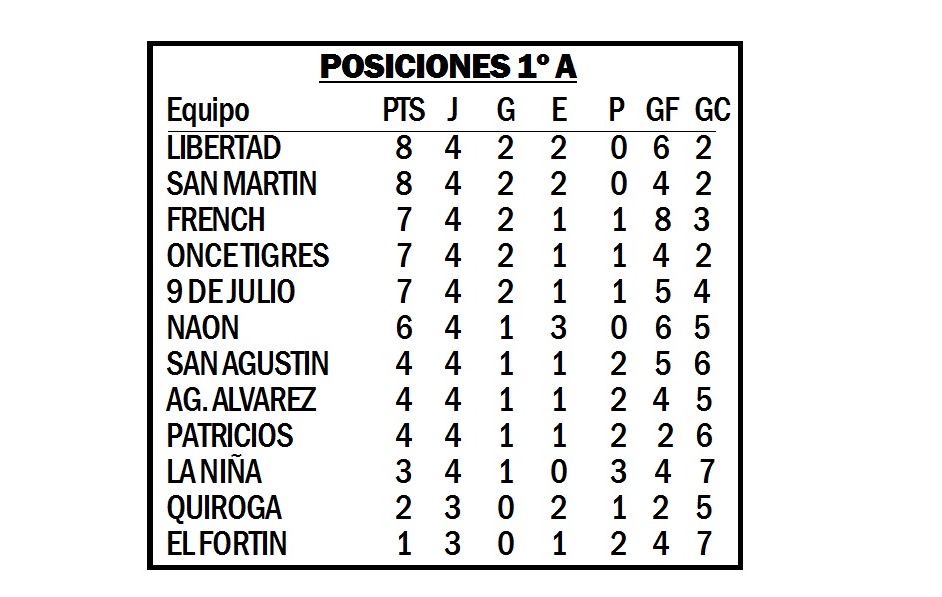 El fin de semana se jugó la cuarta fecha del Campeonato de Primera División A que organiza la Liga Nuevejuliense de Fútbol. El equipo Albinegro de French volvió a ganar, goleando 4 a 0 a Patricios, para quedar a un solo punto de los líderes Libertad y San Martín.
