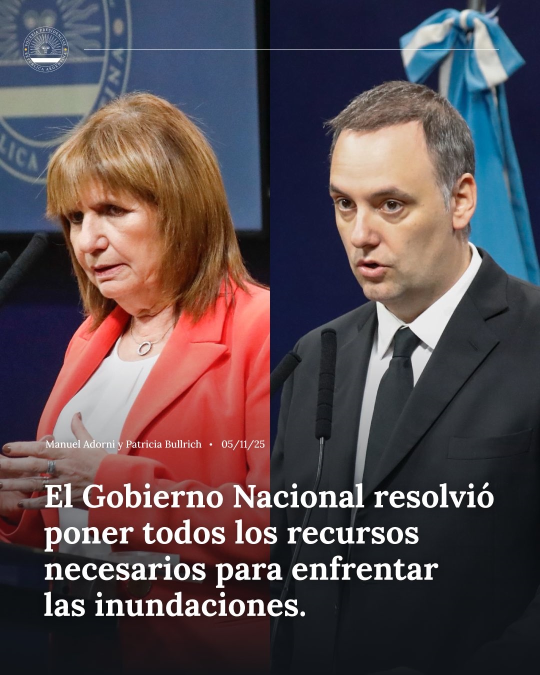 La Ministra de Seguridad Nacional, Patricia Bullrich, junto con el Jefe de Gabinete de Ministros, Manuel Adorni, anunciaron en una conferencia de prensa realizada el miércoles 5 de noviembre que el Estado Nacional se hará cargo de la emergencia y anunció el envío de recursos nacionales para asistir a las zonas afectadas por las inundaciones del Río Salado en la provincia de Buenos Aires.