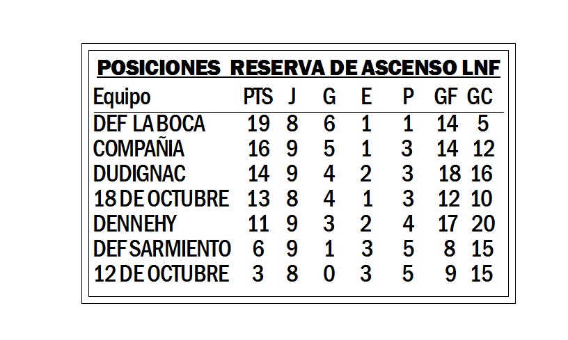 Se jugó la 10ma fecha del Torneo de Reserva de Ascenso organizado por la Liga Nuevejuliense de Fútbol. El equipo de Defensores de la Boca dio un paso muy importante en la lucha por el certamen, al ganarle a su escolta Dudignac por 3 a 1, en el tramo final de la competencia.