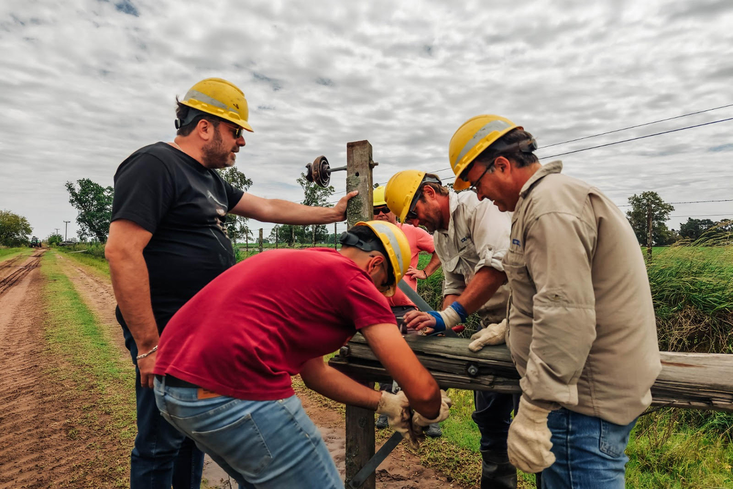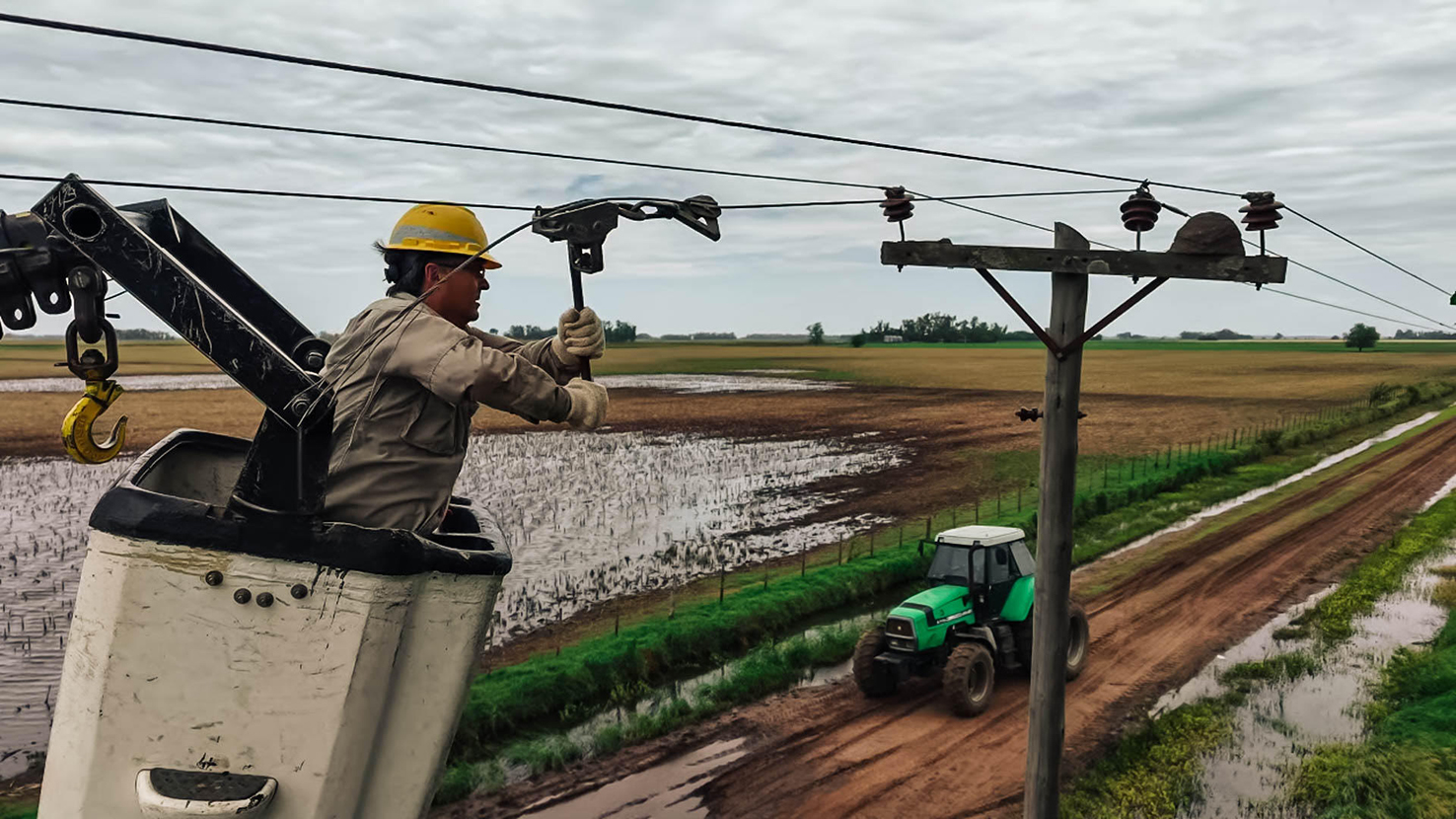Durante la tormenta, la Guardia del Sector Eléctrico no se detuvo. En Carlos María Naón, los técnicos siguieron su trabajo en una de las zonas más afectadas por la tormenta y las inundaciones: caminos anegados, postes caídos y barro que complica cada paso.