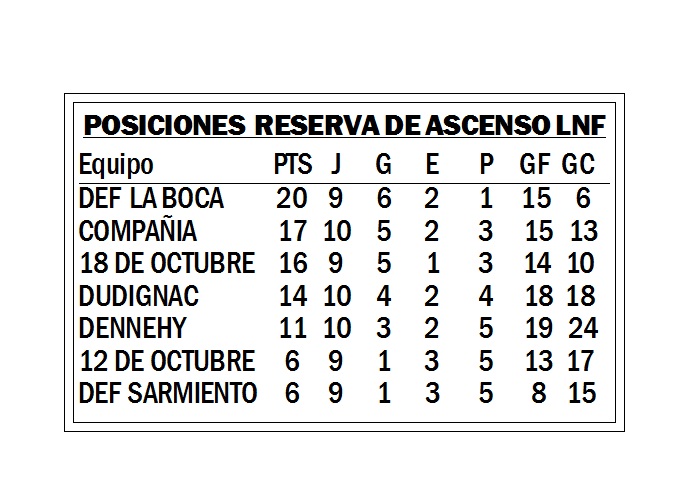 Se jugó la 11ma fecha del Torneo de Reserva de Ascenso organizado por la Liga Nuevejuliense de Fútbol. El íder del torneo, el equipo de Defensores de la Boca empató 1 a 1 con el escolta Compañía y se mantiene la diferencia entre puntero y escolta.