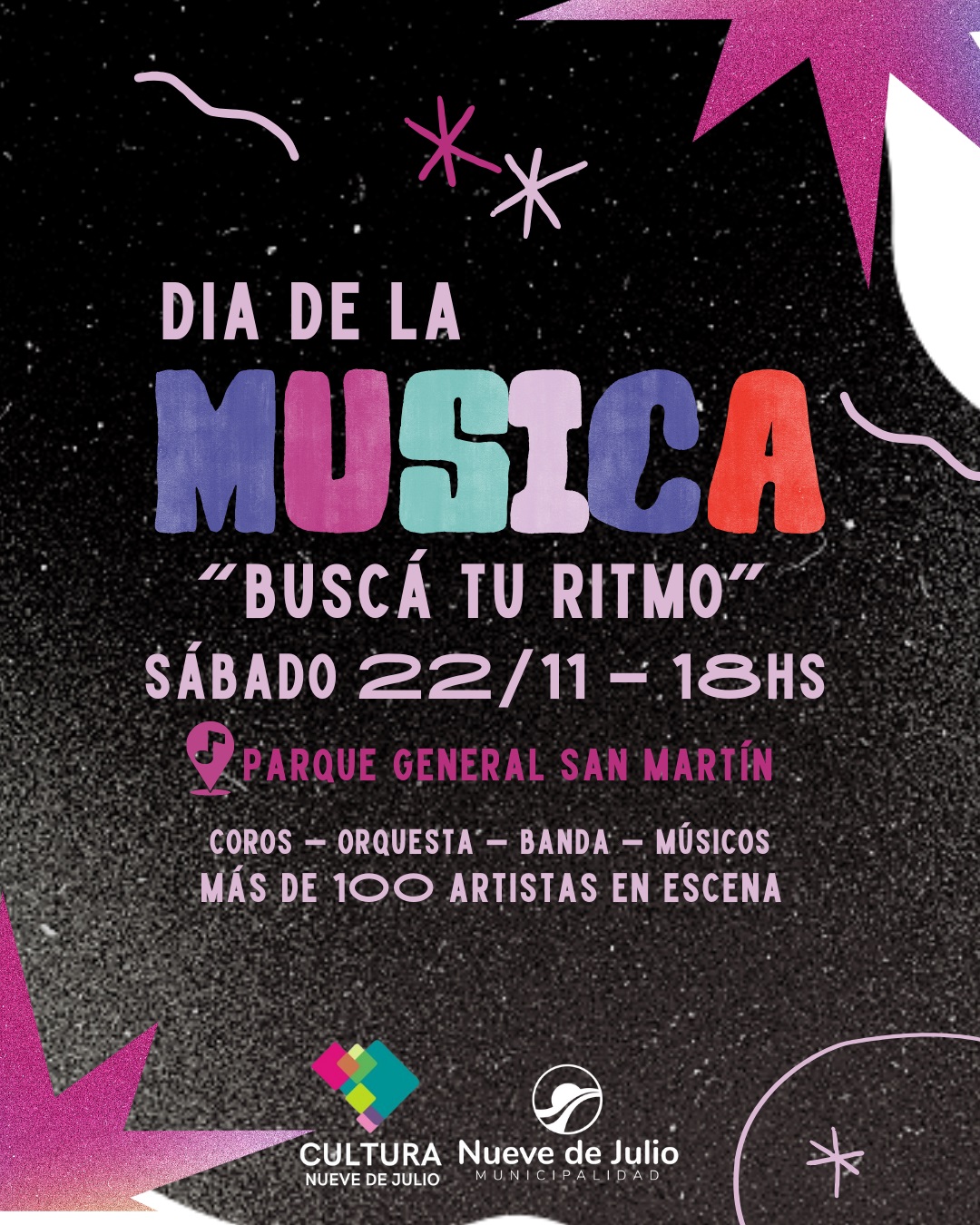 La dirección de Cultura de la Municipalidad de 9 de Julio invita a toda la comunidad a celebrar el Día de la Música, con el evento “Buscá tu ritmo”, que se realizará este sábado 22 de noviembre, desde las 18 hs., en el Parque General San Martín.