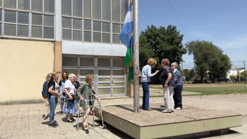 Enseguida, la comitiva se trasladó a las instalaciones de la Escuela Normal Superior. En un gesto cargado de simbolismo, fue entregada a la institución una planta con placa recordatoria, signo de vida y continuidad, ofrenda sencilla y a la vez solemne que quedará como testimonio de este reencuentro. Sin dudas, un momento sustancialmente emotivo lo constituyó cuando, las integrantes de la promoción que estaba presente, fueron invitadas a izar la bandera en el patio del establecimiento.