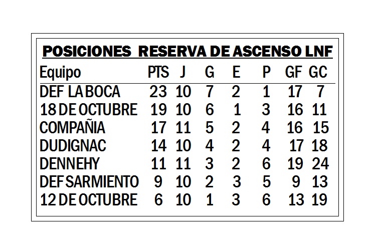 Se jugó la 12da fecha del Torneo de Reserva de Ascenso organizado por la Liga Nuevejuliense de Fútbol. El puntero del torneo, el equipo de Defensores de la Boca se impuso de visitante 2 a 1 ante 12 de Octubre y dio otro paso.