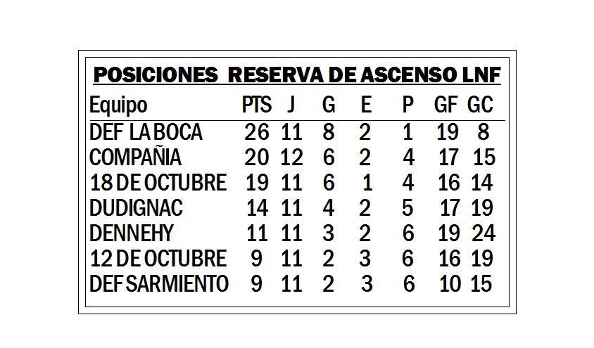 Entre el sábado 6 y el domingo 7 de diciembre se jugó la 13era fecha del Torneo de Reserva de Ascenso que organiza la Liga Nuevejuliense de Fútbol. A una fecha del final, de manera anticipada se consagró campeón Defensores de la Boca al vencer 2 a 1 a Defensores de Sarmiento.