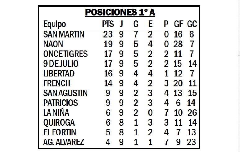 En el adelantado de la Primera A de la Liga Nuevejuliense de Fútbol, el viernes 12 de diciembre el equipo de San Martín se impuso 2 a 1 de visitante ante Agustín Alvarez. Había empezado ganando el Rojo, pero el local lo dio vuelta para finalizar 2 a 1. Con ese triunfo San Martín sigue invicto y líder, mientras que Agustín Alvarez se encuentra en la última posición.