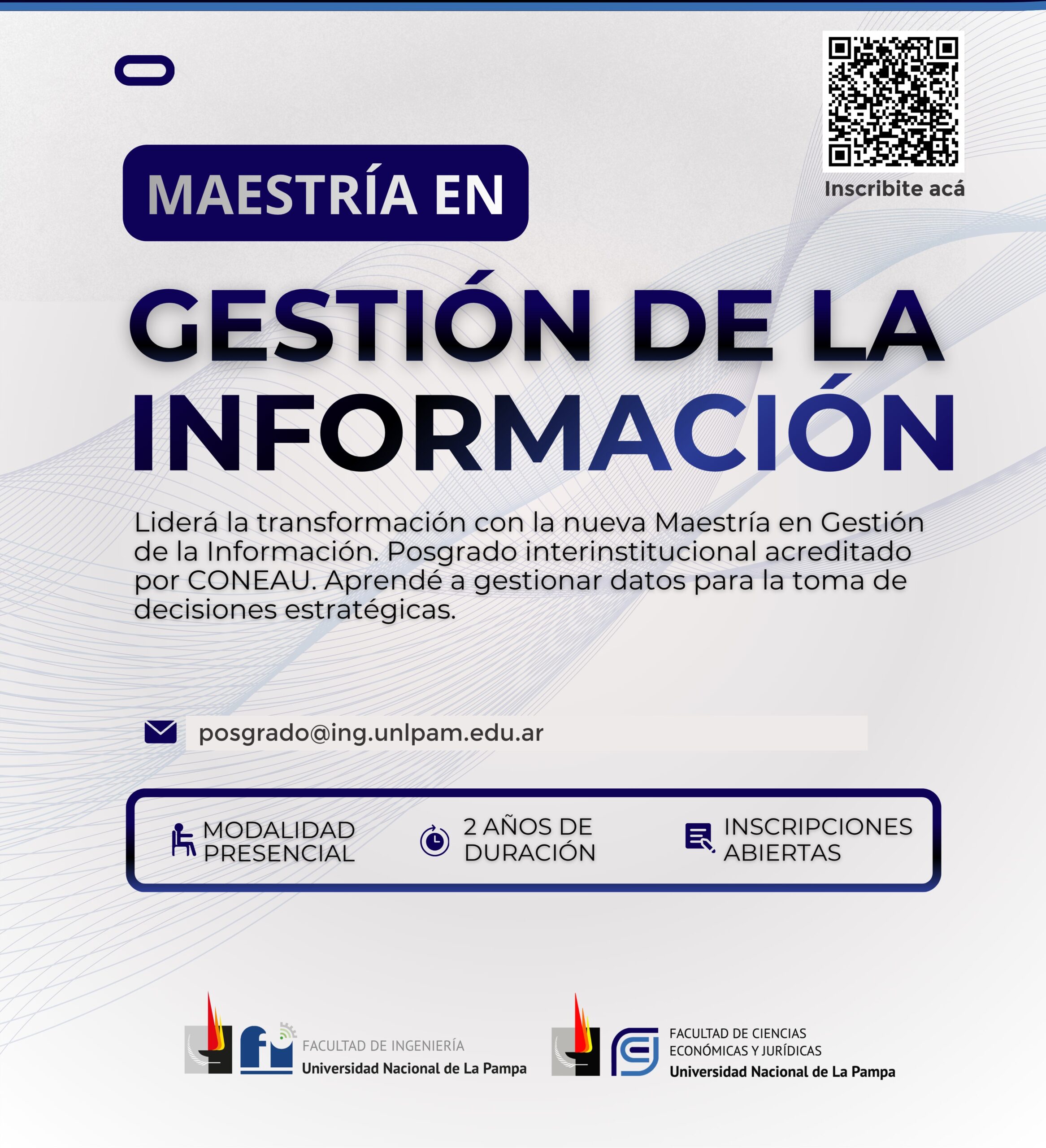 La Facultad de Ingeniería y la Facultad de Ciencias Económicas y Jurídicas de la Universidad Nacional de La Pampa informan que se encuentran abiertas las inscripciones para la primera cohorte (inicio 2026) de la Maestría en Gestión de la Información.