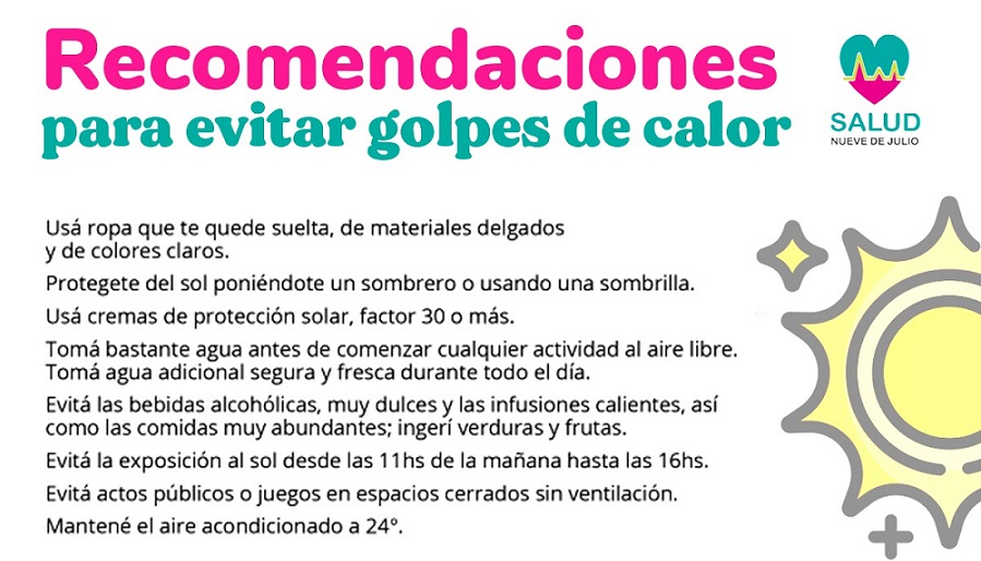 Ante las altas temperaturas pronosticadas para la semana entrante, la secretaría de Salud de la Municipalidad de Nueve de Julio recomienda tomar los cuidados necesarios para prevenir el golpe de calor. Hay que tener en cuenta que puede afectar a personas de cualquier edad, pero los grupos de mayor riesgo son los niños -que no manifiestan sus síntomas con facilidad- y los mayores de 65 años.