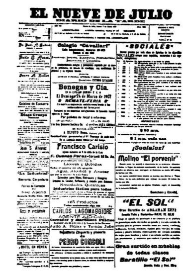 En las postrimerías del siglo XIX hizo su aparición otro periódico que, como el anterior, contribuirá a consolidar aún más el panorama de la prensa local: “El Nueve de Julio”. Este vespertino, que alcanzó la tirada diaria, se ocupó de intereses generales, siendo su propietario Eduardo Moretti, italiano de origen, quien ya había sido propietario de “La Reacción”. Poseía un formato de 40,5 x 38 centímetros, compuesto en cuerpo 10, tenía de 3 hasta 5 columnas de seis centímetros. La estructura formal del periódico, que destinaba la portada a los avisos comerciales, evidencia una estrategia comercial claramente definida para captar anunciantes.