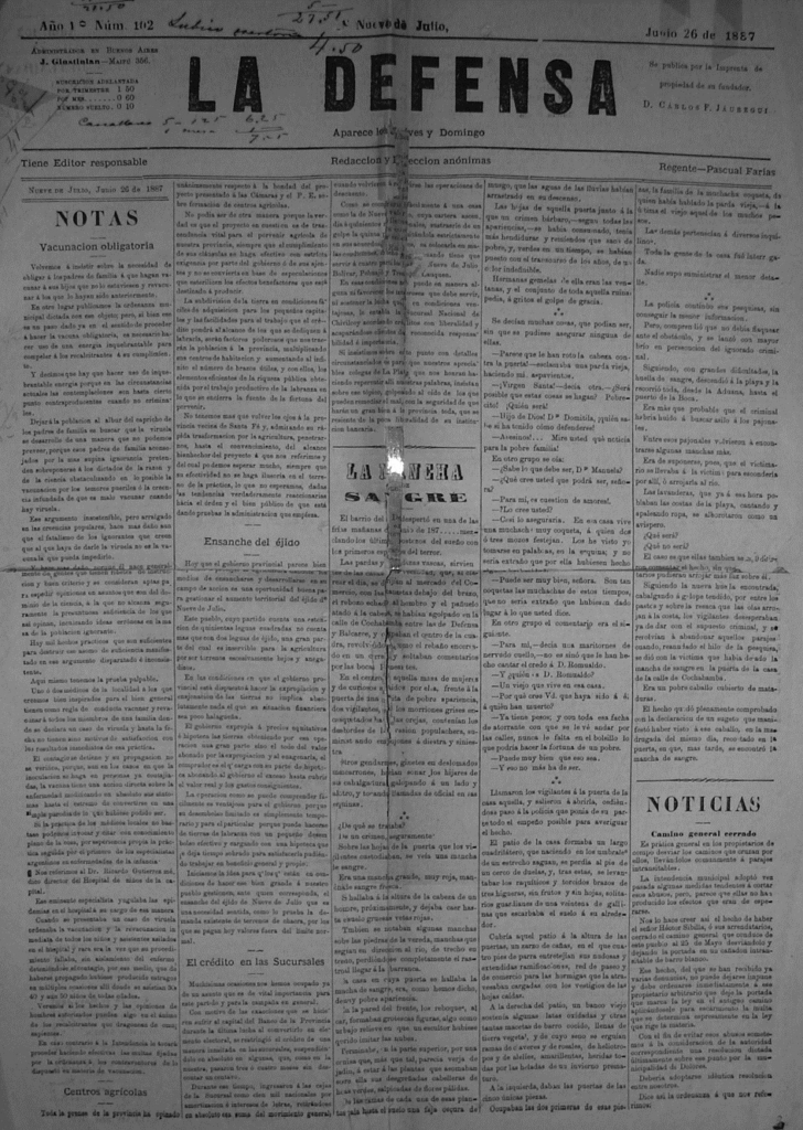 La imprenta que dio origen a “La Defensa” se instaló en un local ubicado en la calle Libertad, esquina Salta. Un polémico personaje, Carlos Jáuregui, figuraba como fundador y propietario, mientras que Cayetano de Briganti, hombre de sólida formación intelectual, asumió las funciones de administrador y Pascual Farías las de regente. Esta distribución de roles aparece como significativa, pues revela que la pequeña empresa gráfica no era un emprendimiento meramente individual sino una iniciativa colectiva que involucraba a varios actores con responsabilidades diferenciadas. De hecho, la figura del regente, algo así como el encargado de supervisar el proceso de composición y la calidad técnica de la impresión, era fundamental en cualquier taller tipográfico de la época, pues de su pericia dependía en buena medida el resultado final del producto impreso.