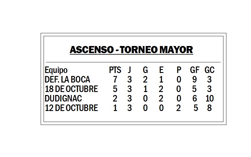 Por la 3era fecha del Torneo Mayor de Ascenso -Segunda Fase- de la Liga Nuevejuliense de Fútbol, el sábado 3 de enero en cancha de Once Tigres, el local Defensores de la Boca -líder del Reducido- empató 1 a 1 ante 18 de Octubre de El Provincial (ganador de la Primera Fase).