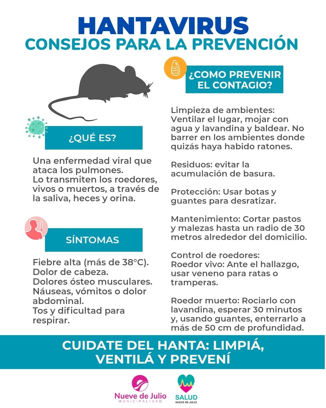 Al registrarse casos de Hantavirus en la Región, la Secretaría de Salud de la Municipalidad de Nueve de Julio, a través del Ministerio de Salud de la Provincia y la Dirección Provincial de Epidemiología recomiendan intensificar la vigilancia para la detección oportuna de los casos de Hantavirus.