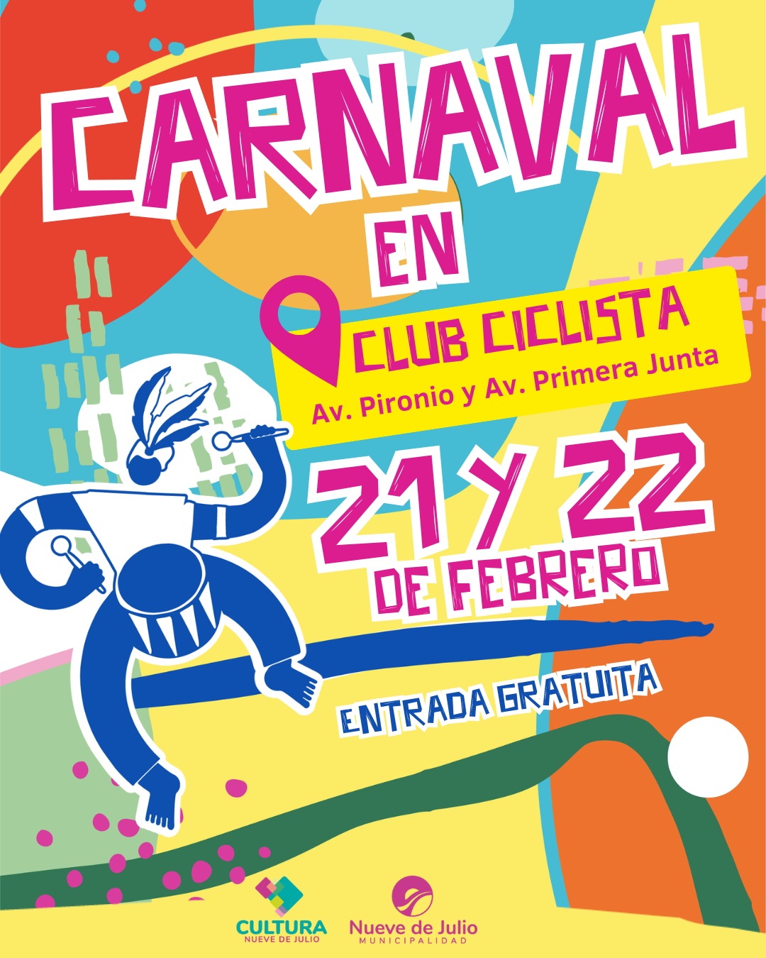 La Municipalidad de 9 de Julio, a través de la Dirección General de Cultura, invita a toda la comunidad a participar de la segunda edición del Carnaval, que se llevará a cabo los días 21 y 22 de febrero en el predio del Club Ciclista.