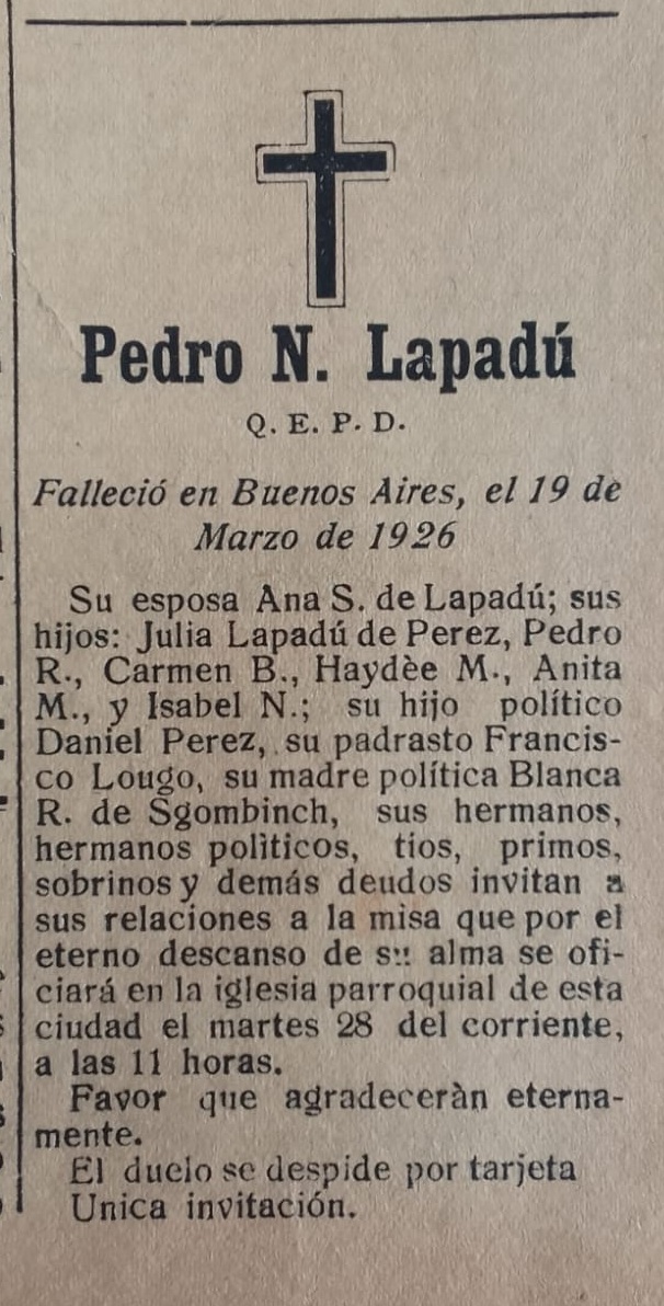 Pedro N. Lapadú falleció en Buenos Aires el 19 de marzo de 1926, cuando contaba 51 años de edad y se desempeñaba como jefe de la estación de Caballito del Ferrocarril del Oeste. Había soportado una enfermedad prolongada y penosa que lo mantuvo postrado largo tiempo.