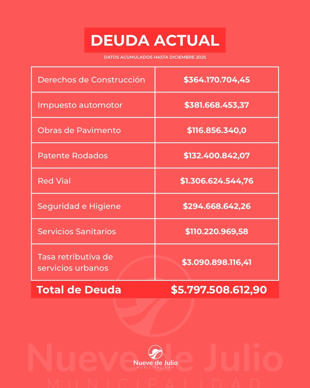 La Municipalidad de Nueve de Julio informa que la deuda acumulada en concepto de tasas e impuestos municipales asciende actualmente a $5.797.508.612, una cifra que impacta de manera directa en la