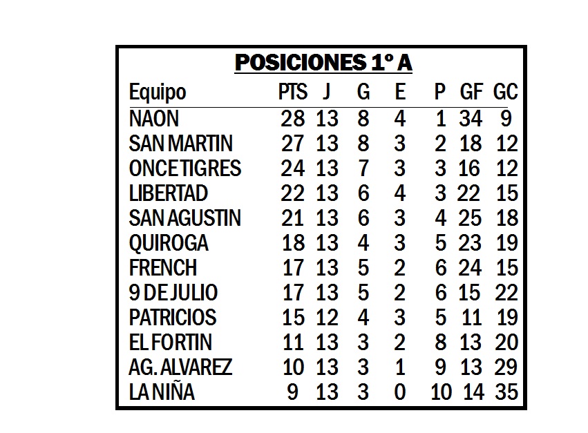 El fin de semana se jugó la fecha 13 del Torneo de Primera División «A» de la Liga Nuevejuliense de Fútbol. Atlético Naón le ganó 1 a 0 a El Fortín y quedó como nuevo puntero, con la derrota de San Martín 3 a 0 ante French.