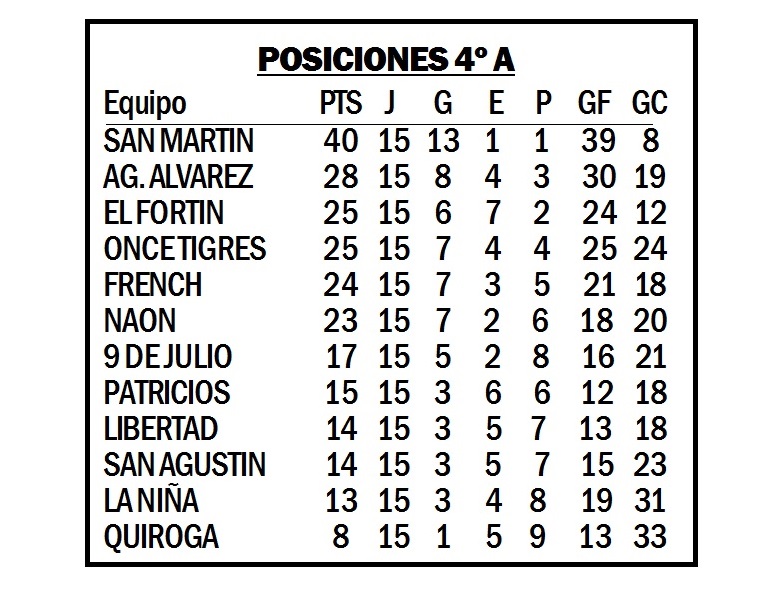 Se disputó la 15ta fecha del Campeonato de Cuarta División de la Liga Nuevejuliense de Fútbol. El equipo de San Martín perdió el invicto después de 13 partidos ganados y 1 empatado, al caer de visitante 1 a 0 en Naón.