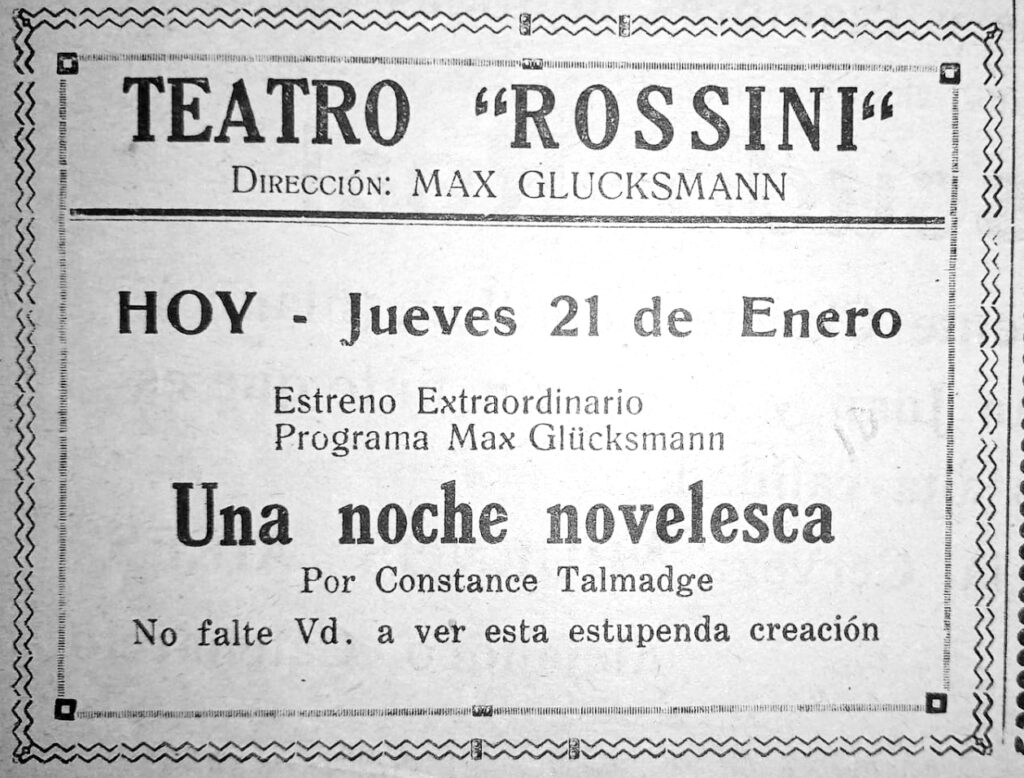 Uno de los últimos avisos publicitarios publicados por la empresa Max Glucksmann como concesionaria del cinema del Teatro Rossini, a principos de 1926.