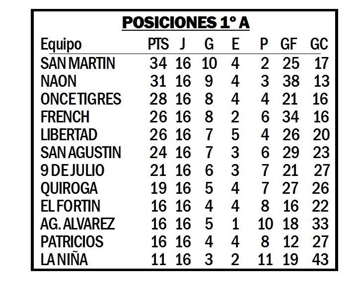 Una vez jugados los seis encuentros de la Primera A de la Liga Nuevejuliense de Fútbol, el equipo de San Martín quedó como único líder al vencer 4 a 3 a Quiroga en un partidazo en el Santiago Noe Baztarrica. Aprovechó la derrota de Naón, que el viernes fue superado 2 a 1 por San Agustín.