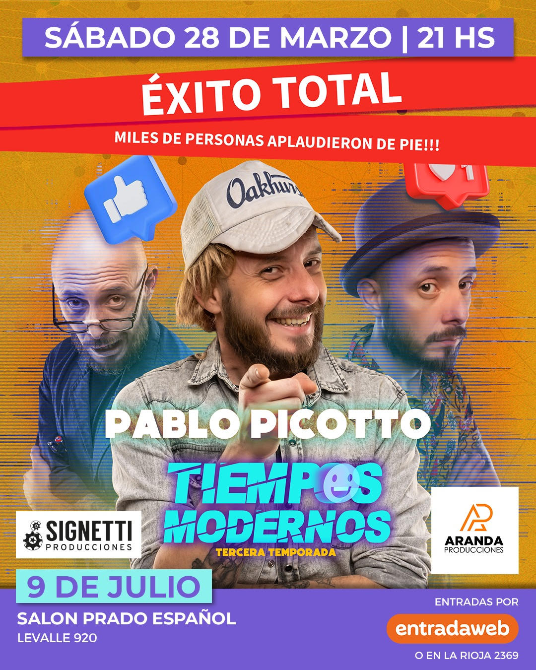 El humorista nuevejuliense Pablo Picotto se encuentra transitando la etapa final de la gira con su espectáculo “Tiempos Modernos”, con humor y reflexión. Después de cuatro temporadas llega a su fin y en ese marco actuará en la ciudad de 9 de Julio este sábado 28 de marzo desde las 21:00 horas en el Salón del Prado Español (Levalle 920 entre San Martín y Mitre).