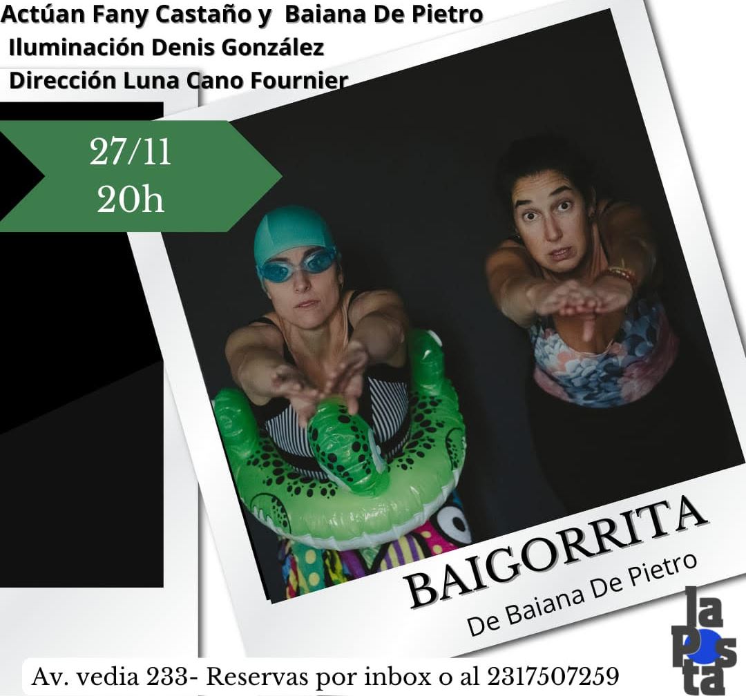 Este domingo 27 de noviembre a partir de las 20 hs en La Posta Casa Cultural (av. Vedia 233) se presenta la obra teatral «Baigorrita» escrita por Baiana De Pietro. La comedia está dirigida por Luna Cano Fournier e interpretada por Baiana de Pietro y Fany Castaño. Cuenta la historia de dos amigas que se embarcan en un viaje soñado para volver a ser las ellas del pasado, pero entre situaciones de humor y absurdo, se dan cuenta que no todo el presente se puede transformar.