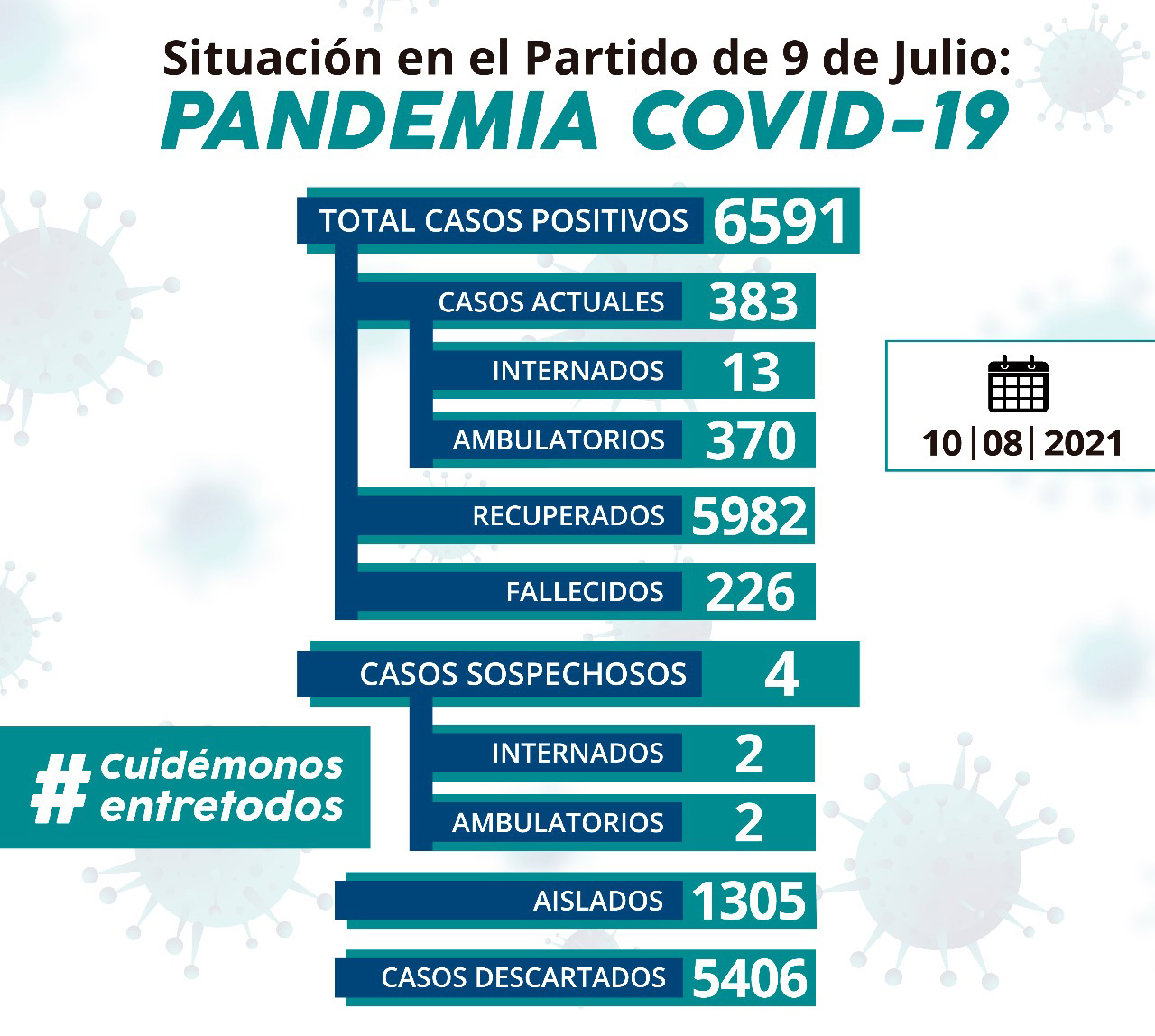 En la jornada de este martes 10, se dieron a conocer 16 casos nuevos de Covid-19 en 9 de Julio. Los resultados de los hisopados fueron 78 negativos y 15 positivos (el restante fue por criterio clínico). Los casos activos son 383. Se mantiene en 226 el número de fallecidos.