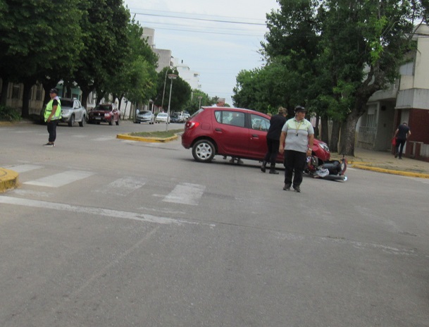 Estuvieron involucrados un Renault Sandero que se desplazaba por calle Alsina y una moto Corven en la que iban dos mujeres. La conductora del Sandero no sufrió inconvenientes. Fue convocado el servicio de ambulancias, trasladando a las ocupantes de la moto, quienes finalmente no presentaron lesiones de consideración.