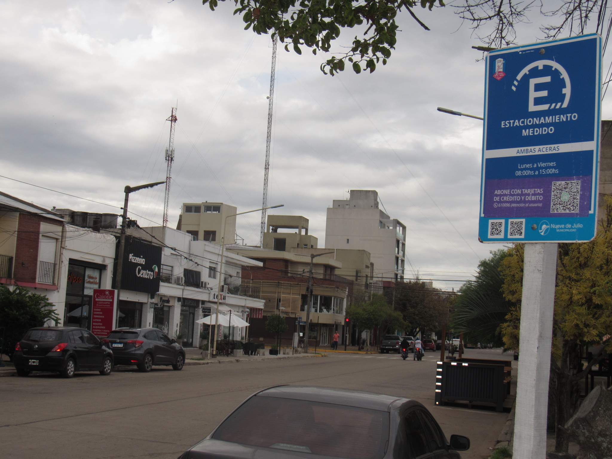 Otro aspecto que merece atención específica, porque suele pasar inadvertido ante la monumentalidad de los edificios o el dinamismo de los vehículos, es la forestación de la avenida. En las fotografías tomadas en invierno, las que muestran los árboles sin follaje, se aprecia la estructura desnuda de ejemplares de porte mediano, probablemente plátanos o fresnos, dispuestos en doble hilera sobre cada vereda. Esta configuración de arbolado en filas paralelas sobre una avenida de calzada ancha es propia de los trazados urbanos de influencia francesa, inspirados en el modelo del Boulevard Haussmann, y su presencia en 9 de Julio habla de una planificación del espacio público que excedía la mera funcionalidad.