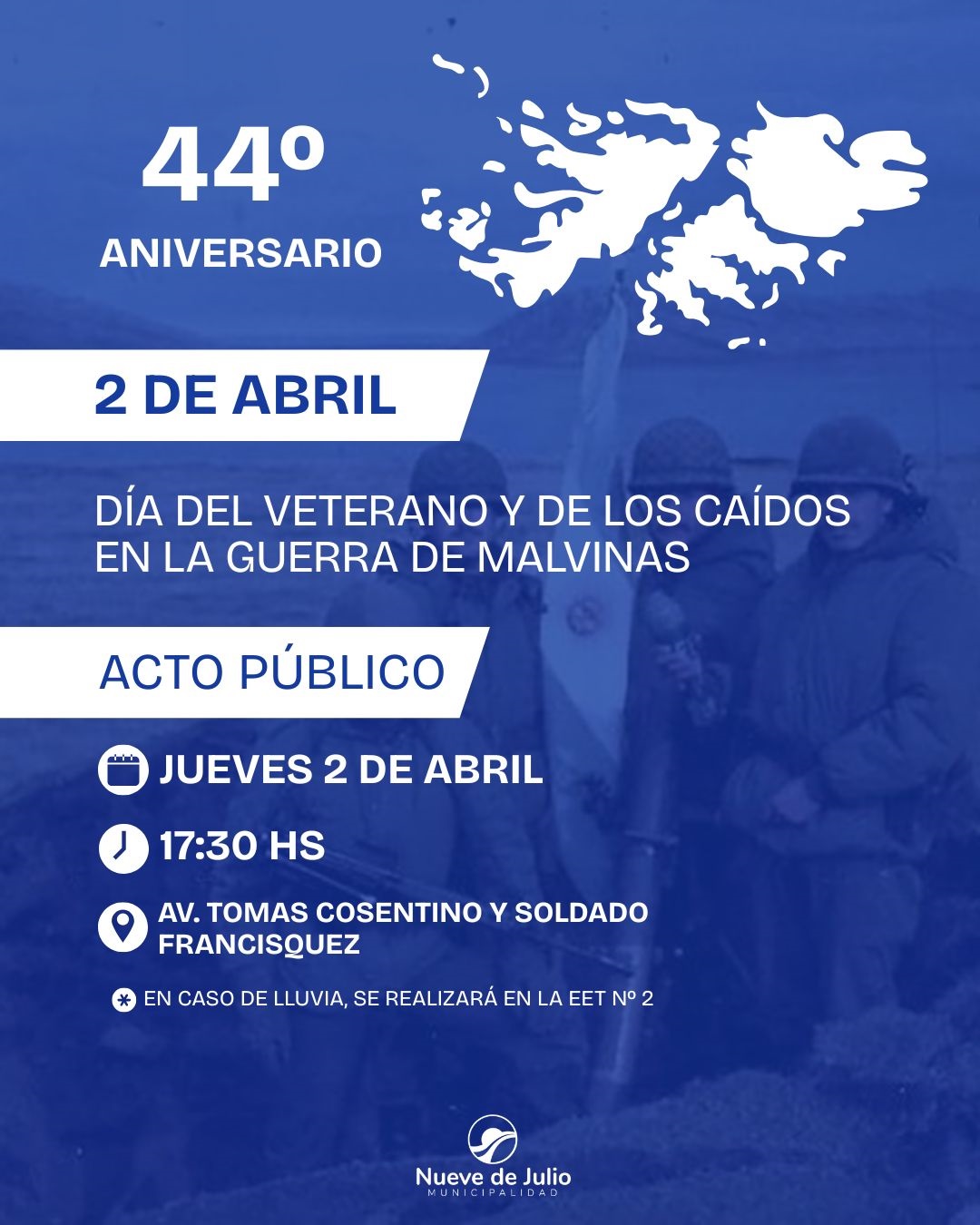 La Municipalidad de 9 de Julio invita a la comunidad a participar del acto oficial en conmemoración del Día del Veterano y de los Caídos en la Guerra de Malvinas, al cumplirse el 44° aniversario de la gesta.